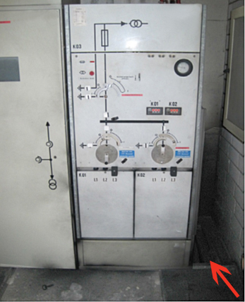 Nach dem Ansprechen der Berstscheibe sind die Lichtbogengase nach unten in den aufgeständerten Doppelboden ausgetreten. Die Bodenöffnung rechts neben der Schaltanlage (Pfeil in der Abbildung) ermöglichte das Entweichen der Lichtbogengase in den Aufstellungsraum der Schaltanlage. Der Monteur erlitt dadurch erhebliche Brandverletzungen.