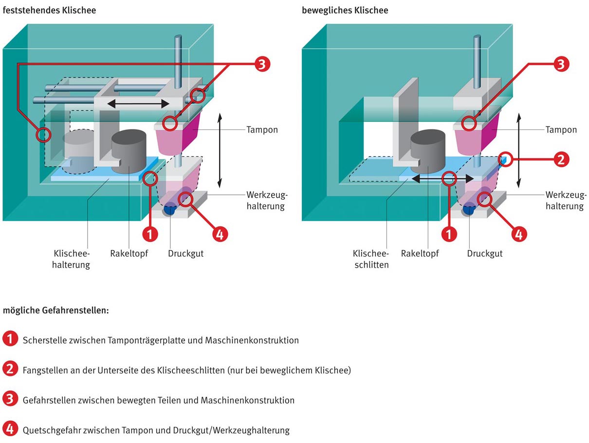 Bei Tampondruckmaschinen mit feststehendem Klischee sind aufgrund zusätzlicher Bewegungen des Tampons mehr Gefahrstellen für Finger, Hand und Arm vorhanden. So entstehen z. B. Quetschstellen für die Finger zwischen der Tamponhalterung und der Maschinenkonstruktion beim Vorfahren und Zurückfahren der Tamponhalterung.