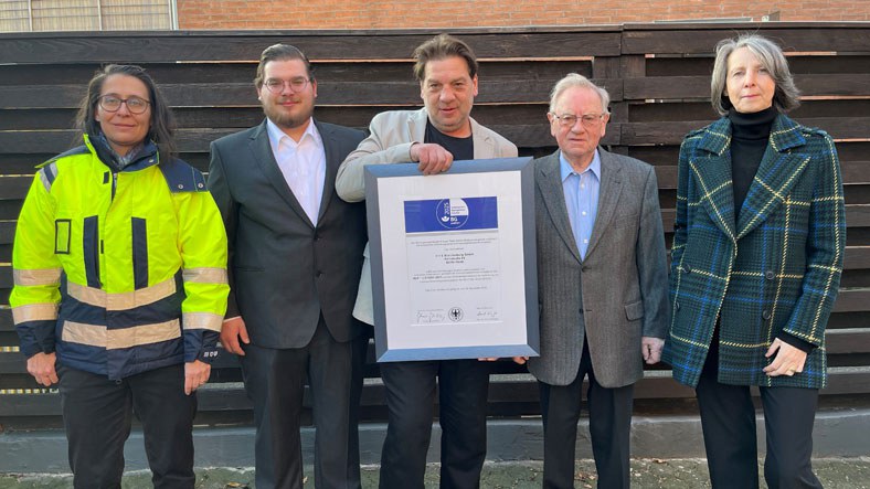 Im Jahr 2022 hat die BG ETEM erstmals das betriebliche Arbeitsschutzmanagement des inhabergeführten Familienunternehmens begutachtet. Mit Erfolg: Das Foto zeigt die Übergabe des AMS-Zertifikats.