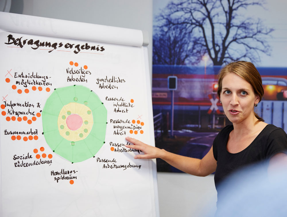 Das Ergebnis der Onlinebefragung wird auf einer Flipchart präsentiert. Die Belastungsfaktoren sind kreisförmig angeordnet und die konkreten Ausprägungen wurden mit einem grünen Punkt markiert. Die Moderatorin fragt die Teilnehmer: Was sagen Sie zu dem Ergebnis? Was ist positiv? Wo muss Ihrer Meinung nach genauer hingeschaut werden? Kein Faktor liegt im "roten Bereich". Die Teilnehmer sehen in einigen Bereichen Handlungsbedarf. Eine Punktabfrage, bei der jeder Teilnehmer vier Klebepunkte bekommt, mit denen er die wichtigsten Themen markieren soll, ergibt drei Schwerpunktthemen: Information und Mitsprachen, passende mengenmäßige Arbeit und Entwicklungsmöglichkeiten.