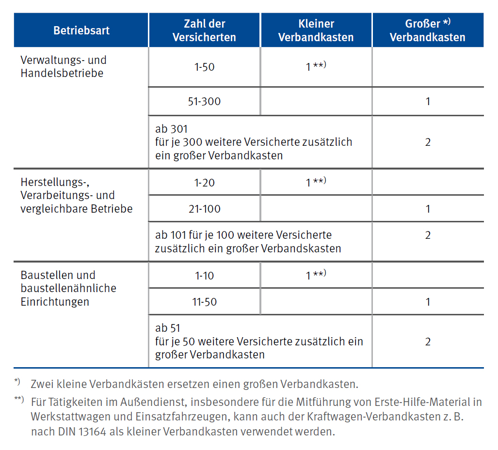 In Abhängigkeit von der Betriebsart und Zahl der Versicherten gelten für die Ausstattung mit Verbandkästen folgende Richtwerte:
