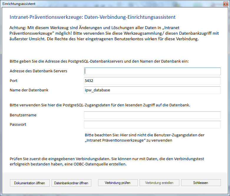 Somit ist es mit diesem Werkzeug möglich, eigene Auswertungen, Berichte, Datenextraktionen und Datenaktualisierungen für die "Intranet Präventionswerkzeuge" durchzuführen.