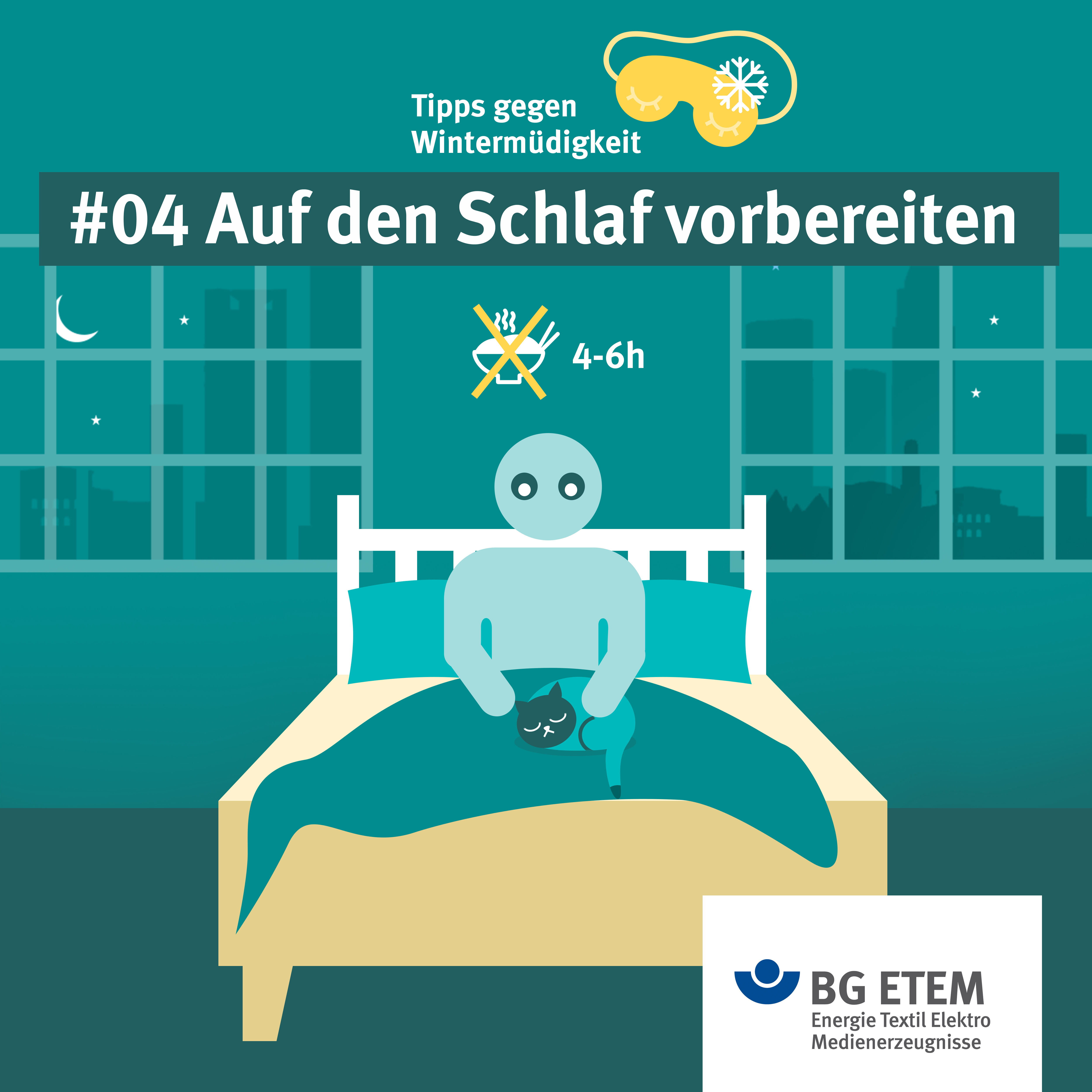 Auf den Schlaf vorbereiten. Am besten gelingt das, wenn ihr ein paar Stunden vor dem Zubettgehen nichts mehr esst. Zusätzlich solltet ihr vier bis sechs Stunden vorher auf Koffein verzichten. Also, lieber mal den Nachmittagskaffee oder Mitternachtssnack weglassen, auch wenn es gerade in der Winterzeit schwer fällt.