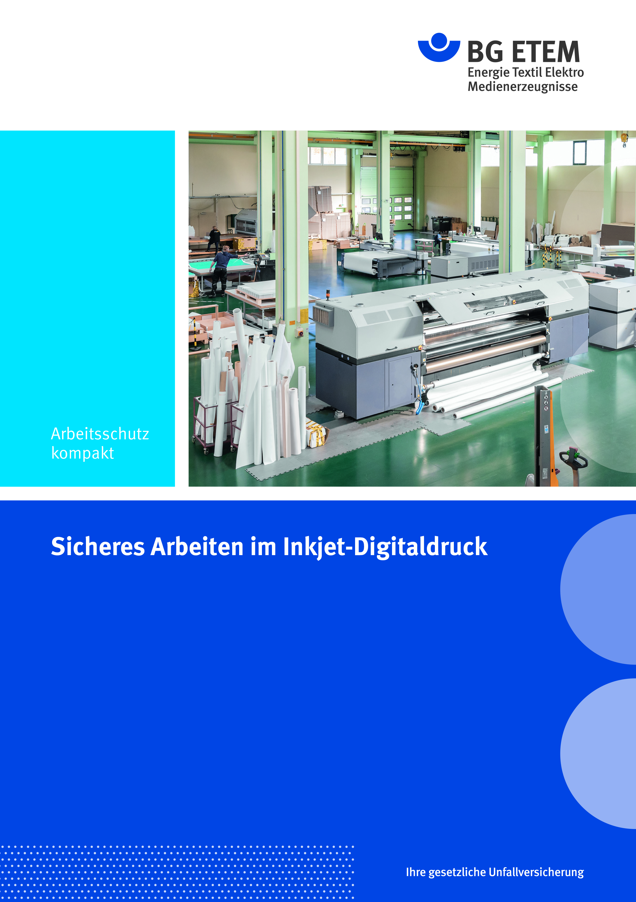 Das Angebot großformatiger Digitaldruckmaschinen wird immer vielfältiger. Die Broschüre informiert über Gefährdungen und Schutzmaßnahmen; ihr Ziel ist es, Hilfestellung zu geben. Es werden die wesentlichen Aspekte der Sicherheitstechnik berücksichtigt, z. B. im Hinblick auf die bewegten Maschinenteile, die chemischen Gefährdungen durch Farben, Tinten, Lösemittel sowie die Arbeitsplatzgestaltung, z. B. beim Schneiden, Lagern und Transportieren. Auch organisatorische Aspekte werden berücksichtigt.