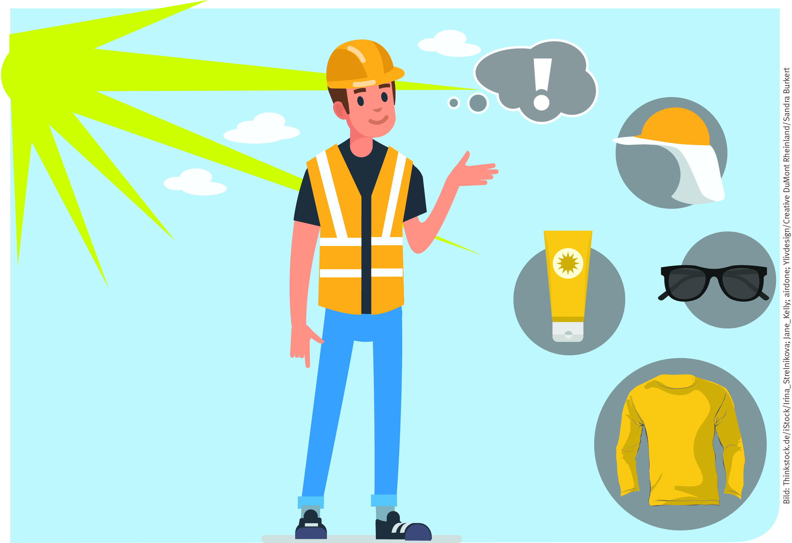 Doch wie kann man sich vor Sonne schützen? Dazu gibt die BG ETEM verschiedene Empfehlungen: Ganz wichtig ist der persönliche Schutz, egal ob für das Kind, den Rentner oder den Berufstätigen, welcher seine Arbeit im Freien und besonders im Sommer verrichten muss. An erster Stelle steht immer der Einsatz von Sonnencreme mit einem möglichst hohen Lichtschutzfaktor. Kopf, Nacken und Augen sind besonders empfindlich. Körperbedeckende Kleidung, eine geeignete Kopfbedeckung (mit Nackenschutz) sowie eine Sonnenschutzbrille für den gewerblichen Bereich sind erforderlich. Bei helmpflichtigen Arbeiten im Freien empfiehlt die BG ETEM zusätzlich, ein Tuch zum Schutz von Ohren, Hals und Nacken einzusetzen. Ist ein Helm nicht notwendig, sollte der Kopf mit Kappen oder Hüten vor Sonnenbestrahlung abgeschirmt werden.